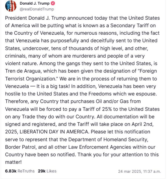 El presidente de Estados Unidos, Donald Trump, anunció el 24 de marzo de 2025 un arancel del 25% a las importaciones de cualquier país que compre petróleo o gas de Venezuela, medida que entrará en vigor el 2 de abril.