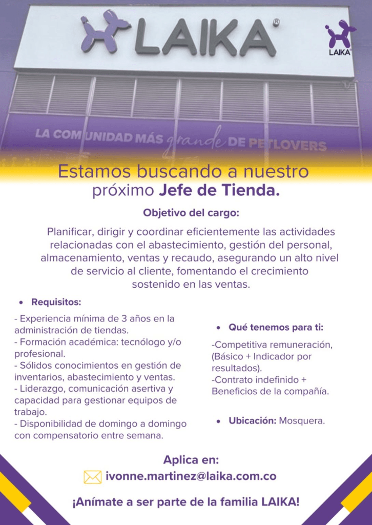 Las vacantes incluyen roles operativos como asistentes de ventas, personal de domicilios y supervisores, así como cargos administrativos como administradores de tienda. Todos los puestos ofrecen contratos indefinidos, salario fijo y prestaciones de ley. Además, los colaboradores acceden a beneficios únicos: días libres remunerados por cumpleaños, mudanza o graduación, apoyo por duelo de mascotas, pólizas de vida y planes de formación. La contratación directa, incluso para repartidores, refuerza el modelo de empleo digno de Laika.