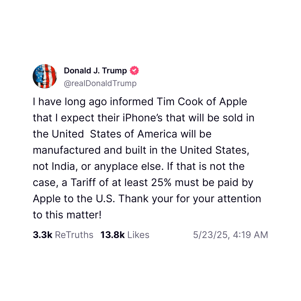 Donald Trump amenazó este viernes a Apple con un arancel del 25% si los iPhones vendidos en EE. UU. no se fabrican en el país. “Hace tiempo informé a Tim Cook que espero que los iPhones se produzcan en EE. UU., no en India ni en otro lugar”, escribió en Truth Social.