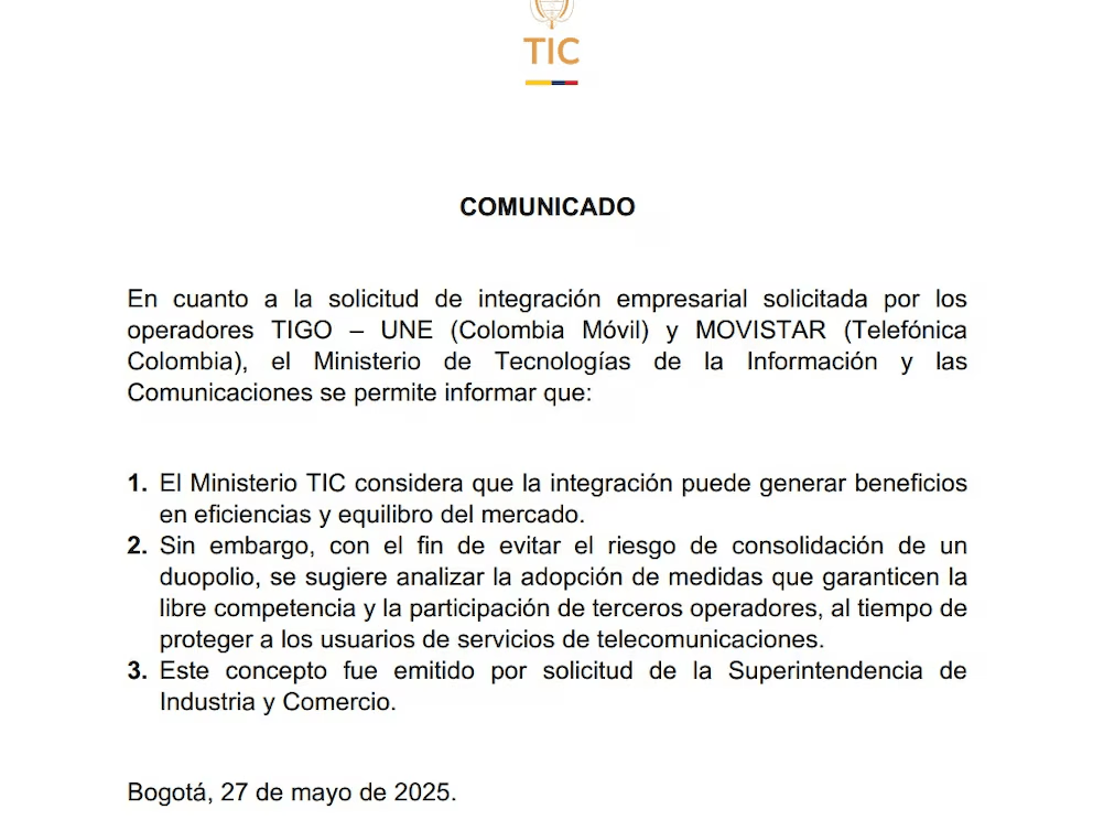 El Ministerio de Tecnologías de la Información y las Comunicaciones (MinTIC) emitió un concepto técnico sobre la integración de Tigo-UNE y Movistar, destacando beneficios en eficiencias operativas, pero advirtiendo riesgos de un posible duopolio en el mercado de telecomunicaciones colombiano, según un análisis solicitado por la SIC.