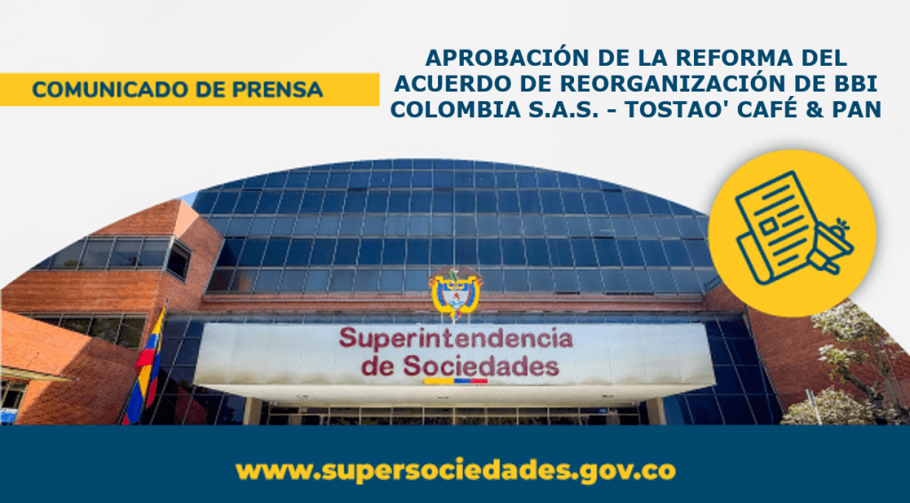 La Superintendencia de Sociedades aprobó el 28 de mayo de 2025 la reforma al acuerdo de reorganización de BBI Colombia S.A.S., operadora de Tostao’ Café & Pan, según los artículos 31, 35 y 36 de la Ley 1116 de 2006. Esta decisión busca garantizar la continuidad operativa de la cadena, afectada desde 2020.