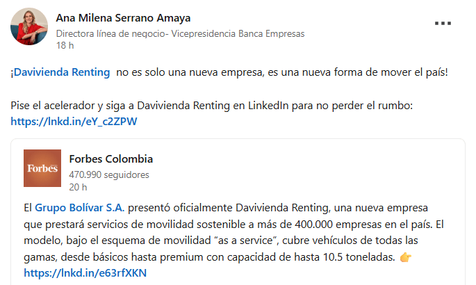 Davivienda y Soluciones Bolívar lanzaron Davivienda Renting, una empresa que ofrece soluciones de movilidad “as a service” con una inversión inicial de $15.000 millones. Dirigida por Ana Milena Serrano, busca atender a más de 400.000 empresas colombianas, optimizando la logística en sectores clave como alimentos, farmacéutica y agroindustria.