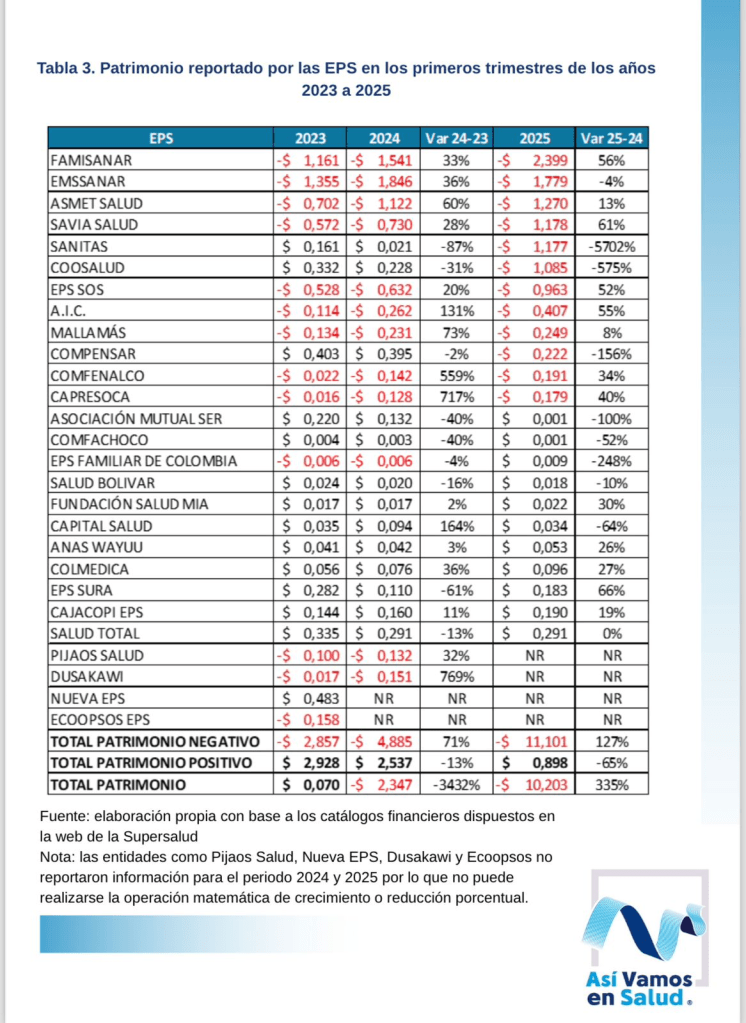 El análisis de Así Vamos en Salud consolidó datos de los primeros trimestres de 2022 a 2025 para las EPS intervenidas: Savia Salud, Asmet Salud, Capresoca, Coosalud, Emssanar, Sanitas, EPS S.O.S, Famisanar y Nueva EPS. En 2022, el patrimonio negativo fue de $1,3 billones, creciendo a $3,3 billones en 2023 (+140%), $5,7 billones en 2024 y $10 billones en 2025 (+74,5%).