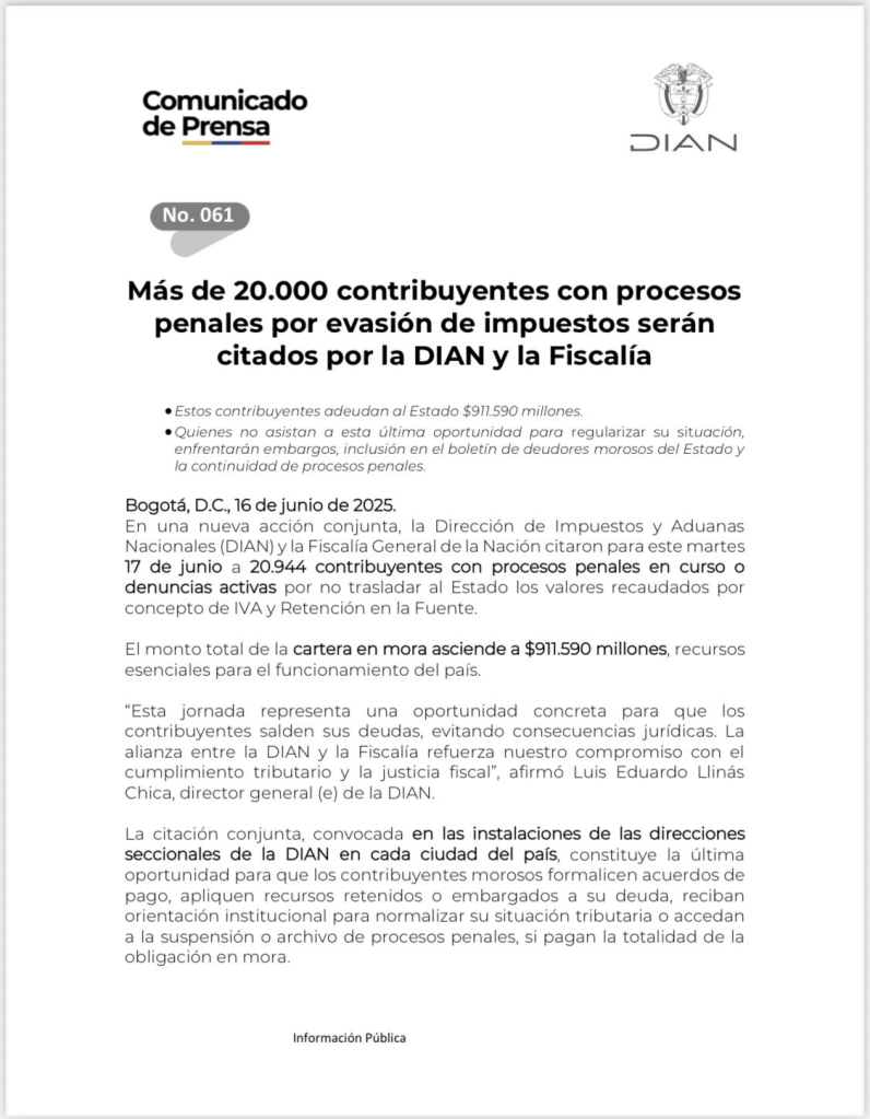 La Dian y la Fiscalía citaron el 17 de junio a 20.944 contribuyentes con deudas por 911.590 millones de pesos, en la Sexta Jornada Nacional de Cobro ‘Al día con la Dian’. Los morosos, con procesos penales por no trasladar IVA y retención en la fuente, deben regularizar su situación para evitar embargos y sanciones.