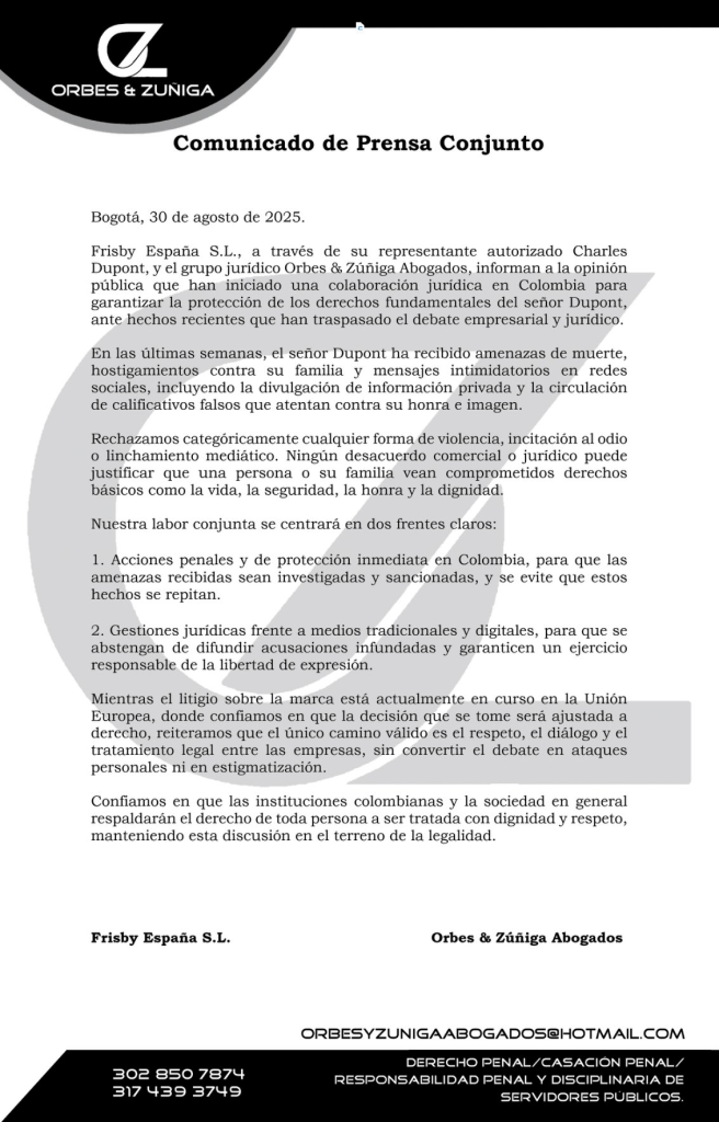 Dupont, quien no imaginaba la magnitud de la controversia, ha sido el blanco de una campaña de intimidación que ha escalado hasta las amenazas de muerte. La firma Orbes & Zúñiga Abogados en Colombia, que representa a Frisby España, ha declarado que el objetivo de estas acciones legales es defender los derechos fundamentales de Dupont y su familia.