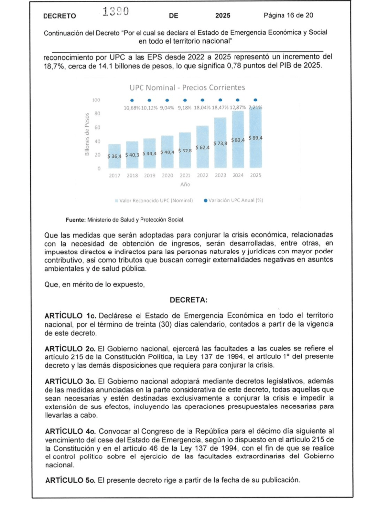 A través de esta herramienta constitucional, el presidente Gustavo Petro asume facultades extraordinarias para expedir decretos con fuerza de ley. El argumento central del decreto de 20 páginas es la incapacidad del Estado para garantizar derechos fundamentales y servicios públicos ante la falta de recursos, sumado a presiones financieras como deudas con el sistema de salud (UPC), compromisos con víctimas del conflicto y obligaciones contractuales atrasadas que superan los $5 billones.