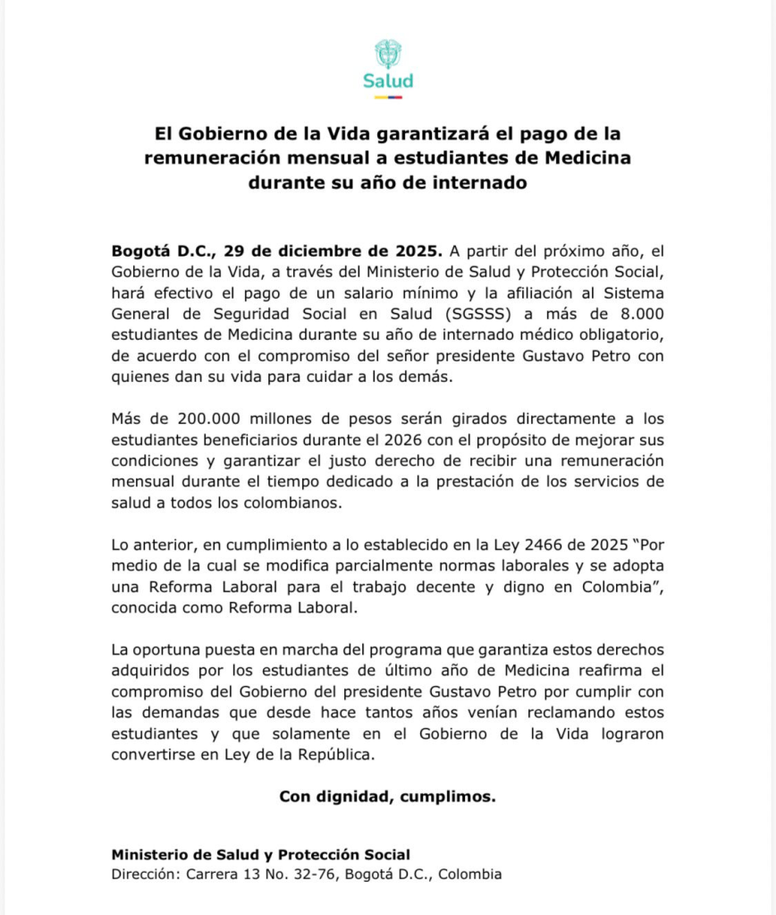 El Ministerio de Salud explicó que la medida se adopta en cumplimiento de la Ley 2466 de 2025, conocida como la Reforma Laboral, que modificó parcialmente la normativa vigente e introdujo disposiciones orientadas a promover el trabajo decente y digno en Colombia. En este marco, el internado médico es reconocido como una labor que requiere protección social y respaldo económico.