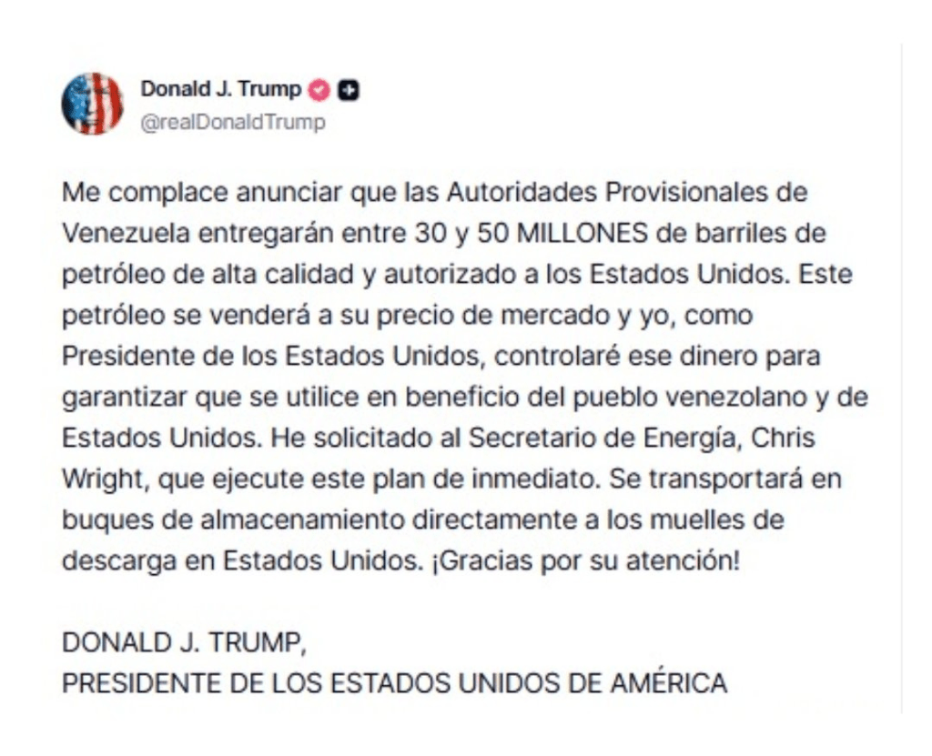 El presidente de Estados Unidos, Donald Trump, afirmó que Venezuela entregará entre 30 y 50 millones de barriles de petróleo para su venta en el mercado estadounidense, tras la captura de Nicolás Maduro y el establecimiento de un gobierno interino en Caracas.