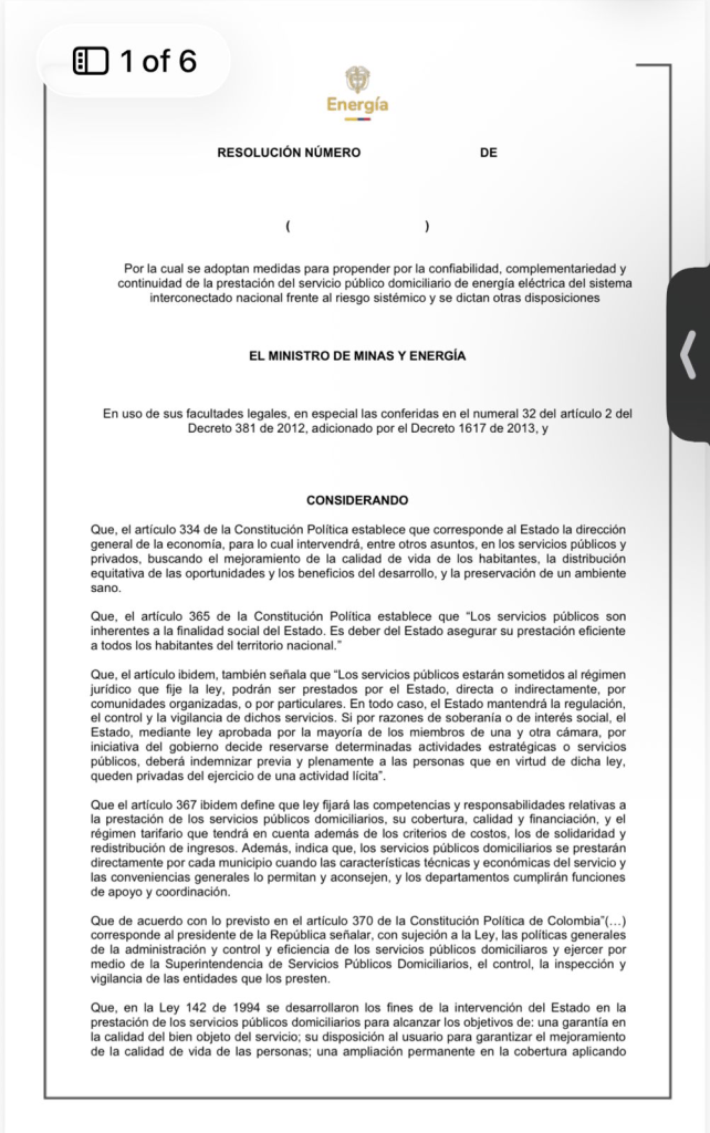 El proyecto de decreto señala que el objetivo central es fortalecer la confiabilidad del sistema eléctrico, en especial en las empresas intervenidas por la Superintendencia de Servicios Públicos. Además, establece lineamientos de política energética para cuantificar la llamada energía firme complementaria, asociada a nuevas tecnologías, dentro del esquema de confiabilidad del sistema.
