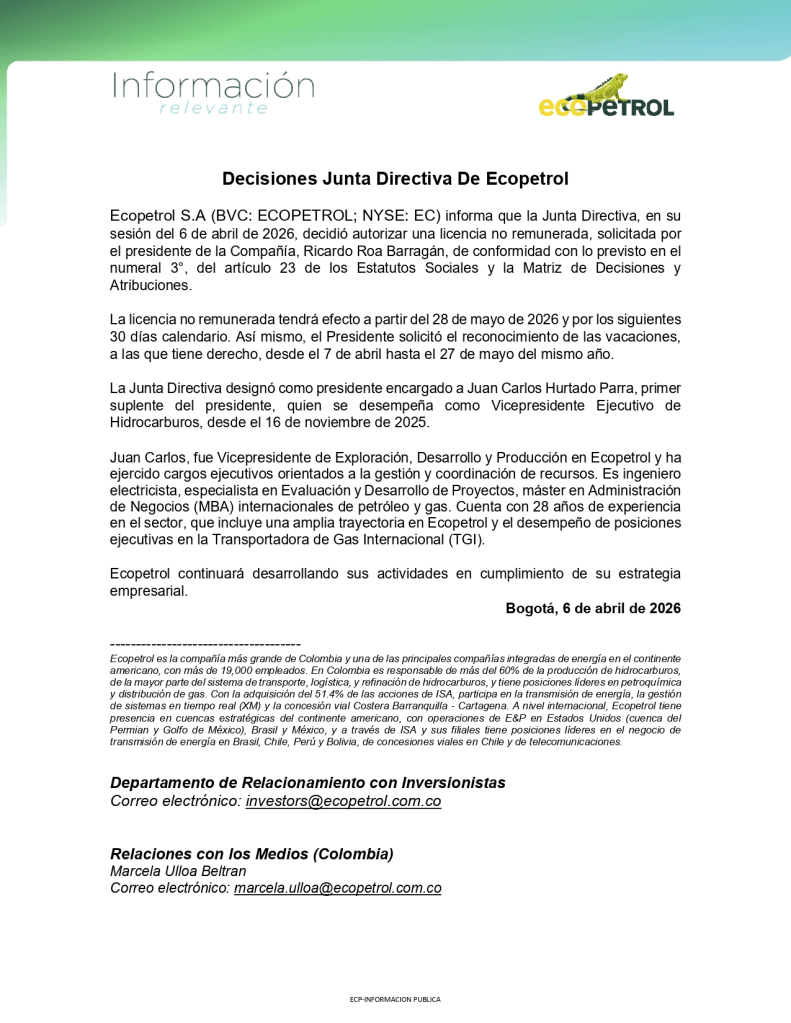 Durante su ausencia, la presidencia será asumida de forma encargada por Juan Carlos Hurtado Parra, actual vicepresidente ejecutivo de Hidrocarburos, con 28 años de experiencia en el sector energético. La compañía señaló que el encargo garantiza la continuidad operativa en un momento de presión financiera y de escrutinio sobre su dirección.