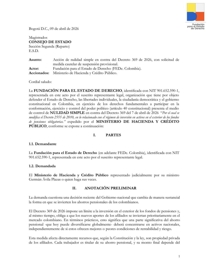 En el frente judicial, la Fundación para el Estado de Derecho solicitó al Consejo de Estado la nulidad del decreto y pidió su suspensión provisional. La organización argumenta que el ahorro pensional tiene una destinación específica y que su redirección obligatoria hacia activos locales podría exceder las facultades regulatorias del Ejecutivo.