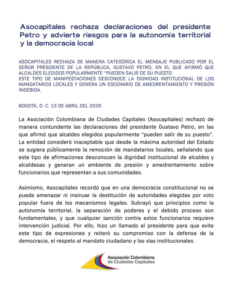 Asocapitales sostuvo que estas afirmaciones desconocen la autonomía de los entes territoriales y alteran el marco constitucional que regula la elección y permanencia de los mandatarios locales. El gremio señaló que los alcaldes no pueden ser objeto de amenazas de remoción por decisiones relacionadas con política tributaria, ya que su permanencia en el cargo está sujeta exclusivamente a los procedimientos definidos por la Constitución y la ley.
