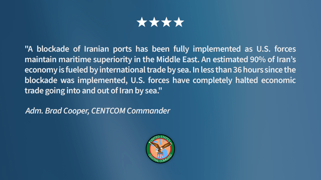 El almirante Brad Cooper, jefe del CENTCOM, afirmó que la operación “se ha implementado por completo” y que ha logrado cortar el comercio marítimo iraní. El funcionario sostuvo que cerca del 90% de la economía del país depende de este canal, lo que convierte al bloqueo en una herramienta directa de presión económica.