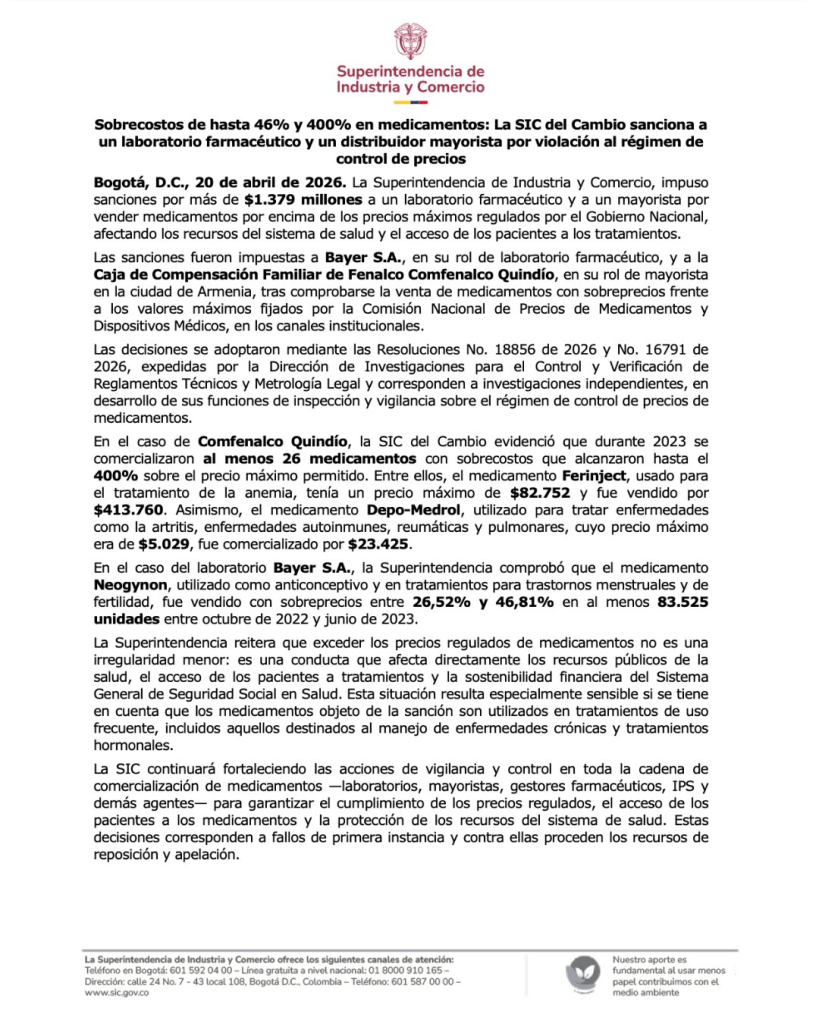 La Superintendencia de Industria y Comercio impuso sanciones que superan los 1.379 millones de pesos a Bayer S.A. y a la Caja de Compensación Familiar Comfenalco Quindío por incumplir el régimen de control de precios de medicamentos en Colombia. La autoridad concluyó que ambas entidades vendieron fármacos por encima de los topes fijados por el Estado, con incrementos que en algunos casos alcanzaron hasta el 400%.