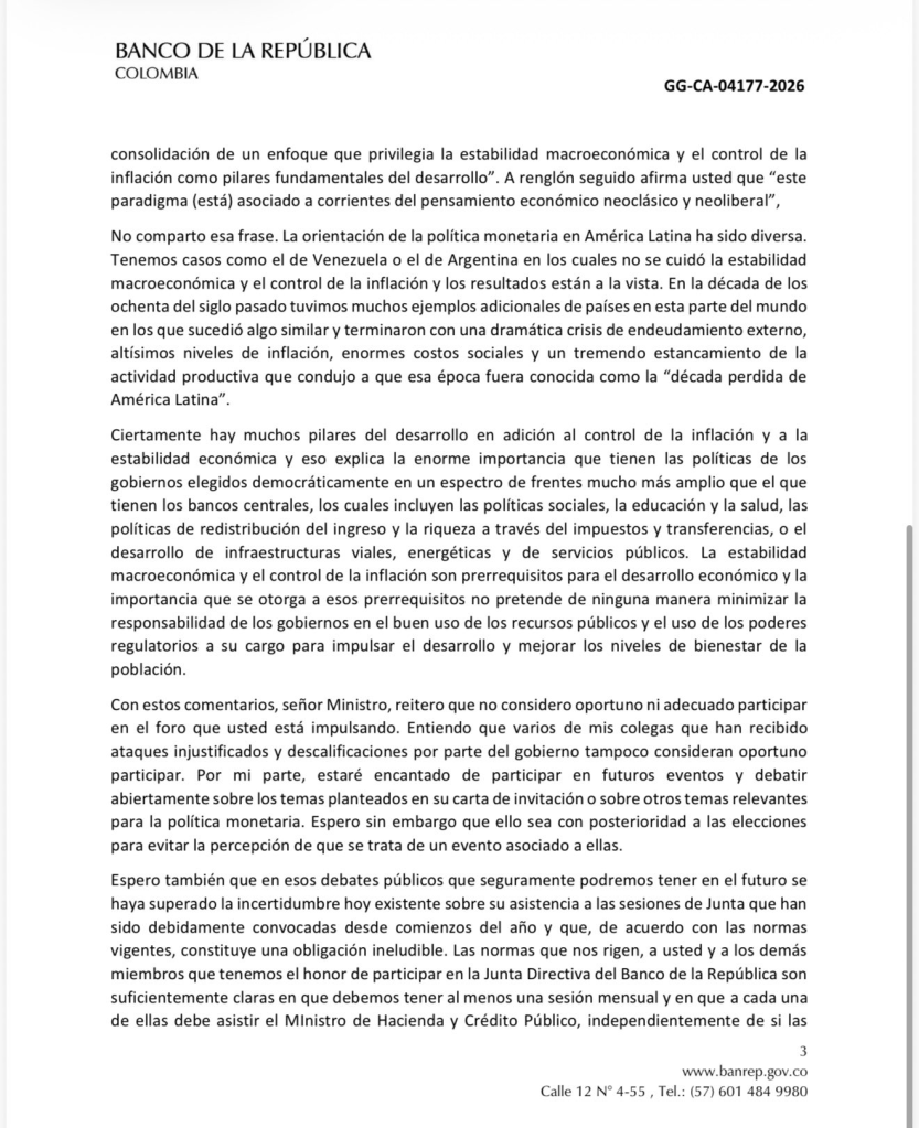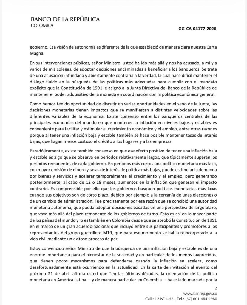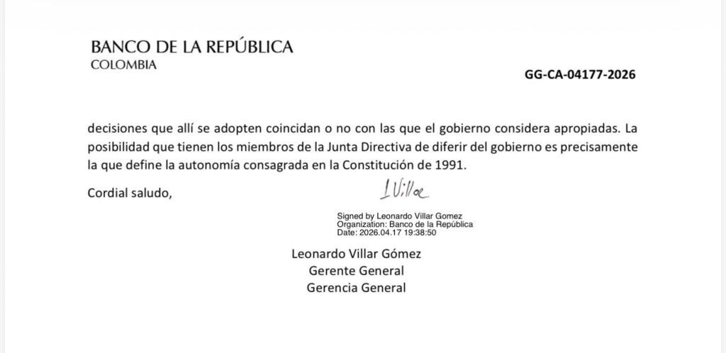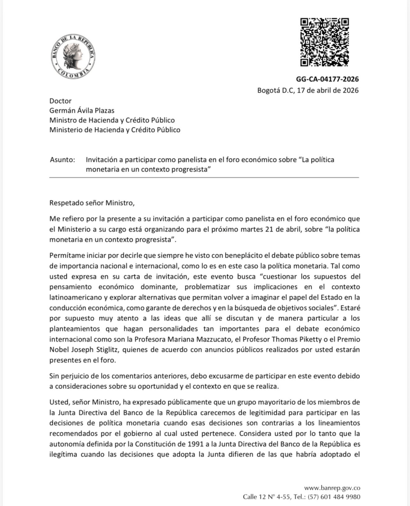 El gerente del Banco de la República, Leonardo Villar, envió una carta al ministro de Hacienda, Germán Ávila Plazas, en la que declina participar en un foro del Gobierno y responde a los cuestionamientos sobre la legitimidad de la Junta Directiva y sus decisiones. El documento, fechado el 17 de abril de 2026 en Bogotá, se conoce en la antesala del evento “La política monetaria en un contexto progresista”, convocado para hoy, y profundiza el choque institucional entre el banco central y el Ejecutivo.
