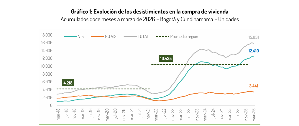 El impacto se refleja con mayor fuerza en los segmentos más vulnerables. En los últimos doce meses, entre abril de 2025 y marzo de 2026, se acumularon 15.851 desistimientos en Bogotá y Cundinamarca. De ese total, el 78% corresponde a vivienda de interés social, lo que evidencia que el problema está concentrado en hogares con menores ingresos y mayor dependencia de subsidios.