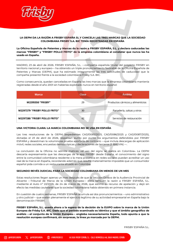 La Oficina Española de Patentes y Marcas declaró la caducidad de tres registros de la cadena colombiana Frisby en España y falló a favor de Frisby España, al concluir que la marca no tuvo uso real y efectivo en ese país durante el periodo exigido por la normativa. La decisión administrativa fue emitida el día de hoy y marca un giro clave en un litigio que también involucra a la Oficina de Propiedad Intelectual de la Unión Europea, que aún debe pronunciarse sobre el alcance comunitario del caso.