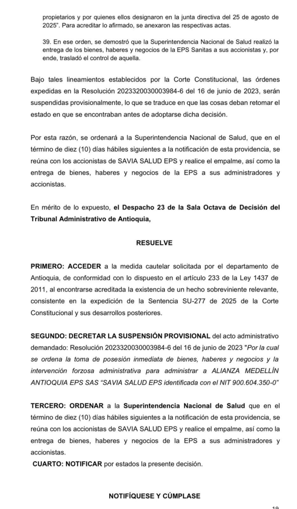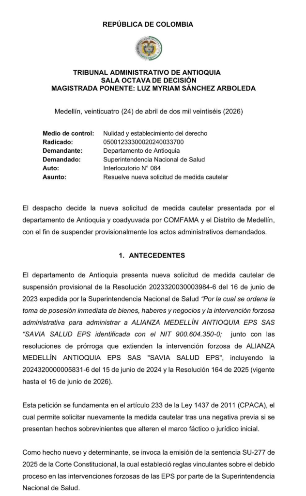 El Tribunal Administrativo de Antioquia ordenó suspender de manera provisional la intervención forzosa de la EPS Savia Salud, que estaba bajo control de la Superintendencia Nacional de Salud desde junio de 2023, y dispuso su devolución a sus accionistas públicos en un plazo de diez días hábiles. La decisión judicial frena temporalmente una de las intervenciones más relevantes del sistema de salud en Colombia y abre un nuevo capítulo en la disputa jurídica sobre el alcance de estas medidas.
