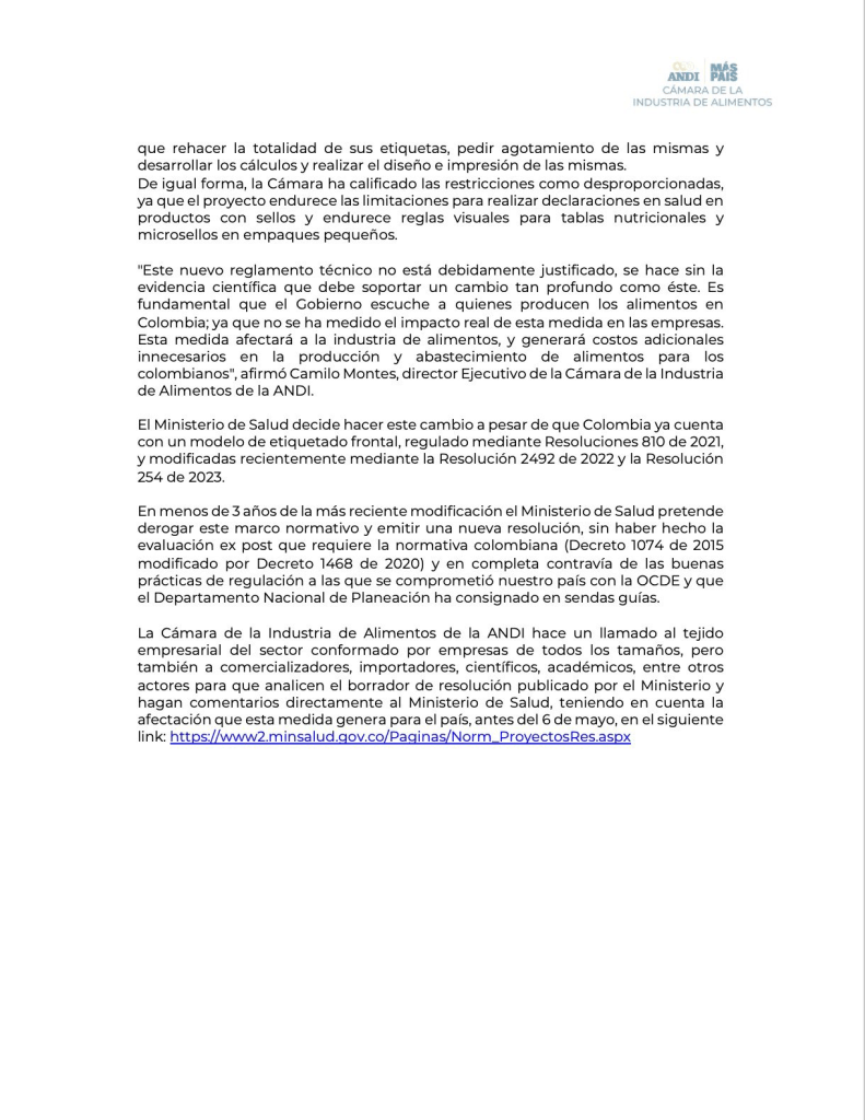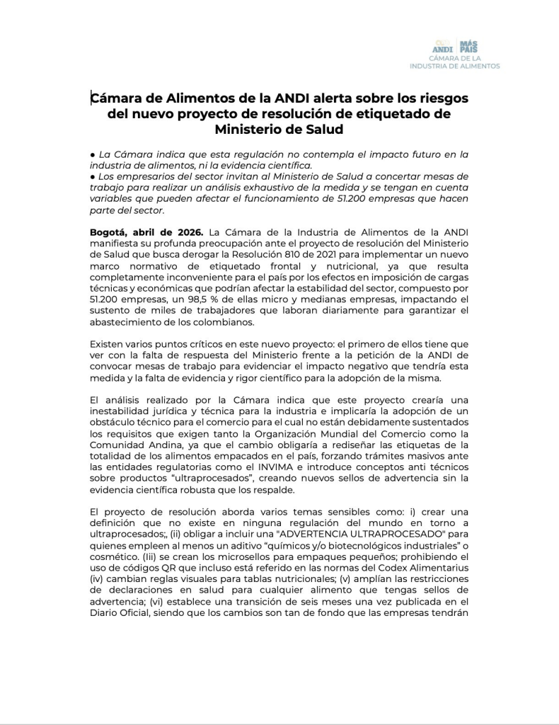 La ANDI estima que la medida afectaría a unas 51.200 empresas del sector de alimentos en Colombia, de las cuales el 98,5% son micro, pequeñas y medianas empresas. Este segmento, con menor capacidad financiera, sería el más expuesto a los costos de rediseño de empaques, ajustes de producción y destrucción de material ya impreso.
