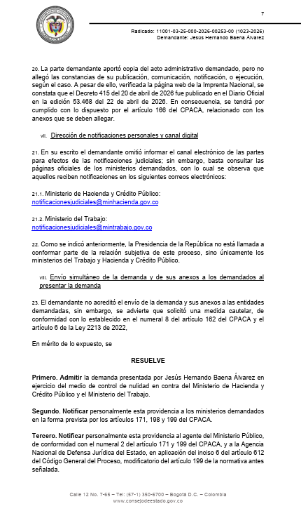 La demanda fue admitida por la Sección Segunda del Consejo de Estado y activa el trámite contencioso en el que deberán intervenir los ministerios de Hacienda y Trabajo como entidades demandadas. También se vinculan organismos como la Agencia Nacional de Defensa Jurídica del Estado y el Ministerio Público, que participarán en la defensa del acto administrativo mientras se define su validez jurídica.