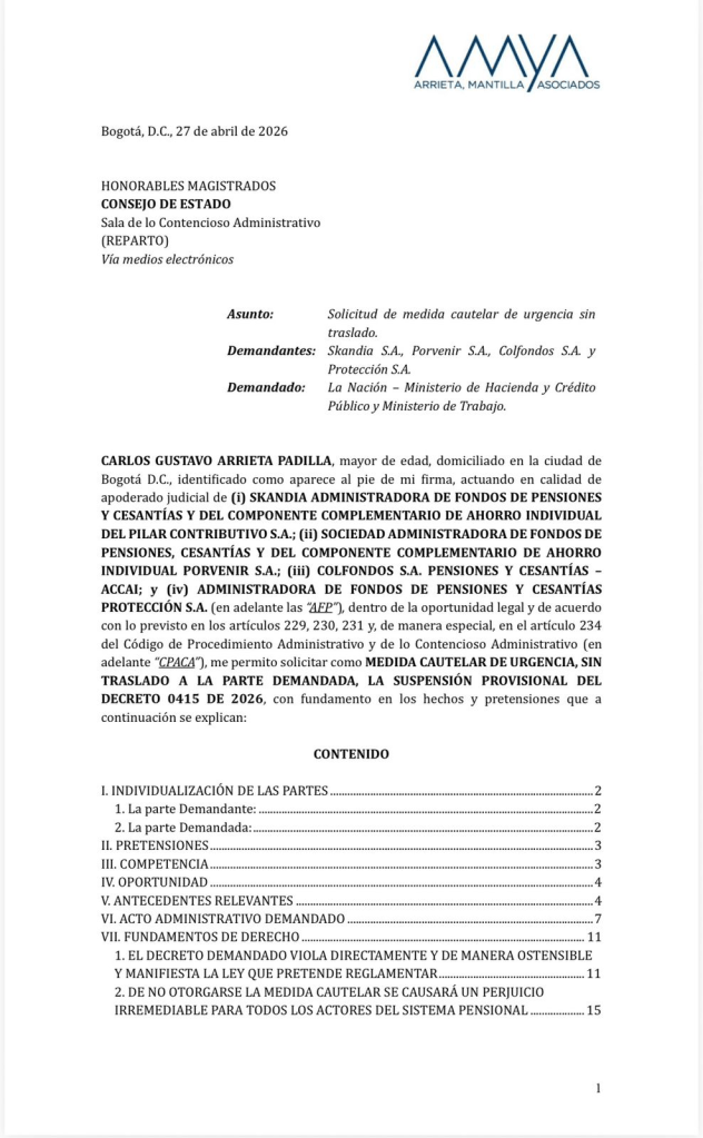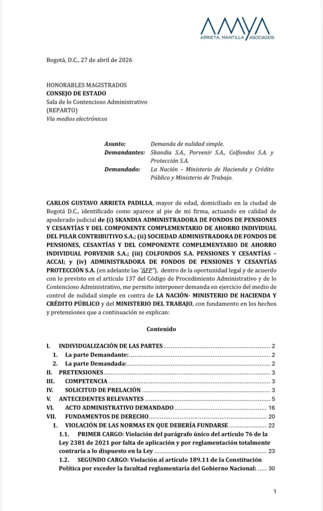 Las cuatro administradoras de fondos de pensiones privadas en Colombia, Skandia, Colfondos, Protección y Porvenir, presentaron ante el Consejo de Estado una demanda de nulidad contra el Decreto 0415 de 2026 y solicitaron una medida cautelar de urgencia para frenar de forma provisional el traslado de cerca de 25 billones de pesos hacia Colpensiones.