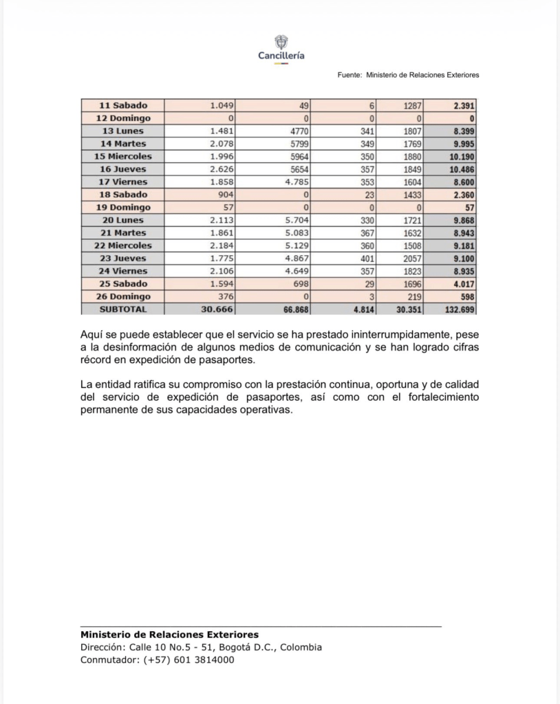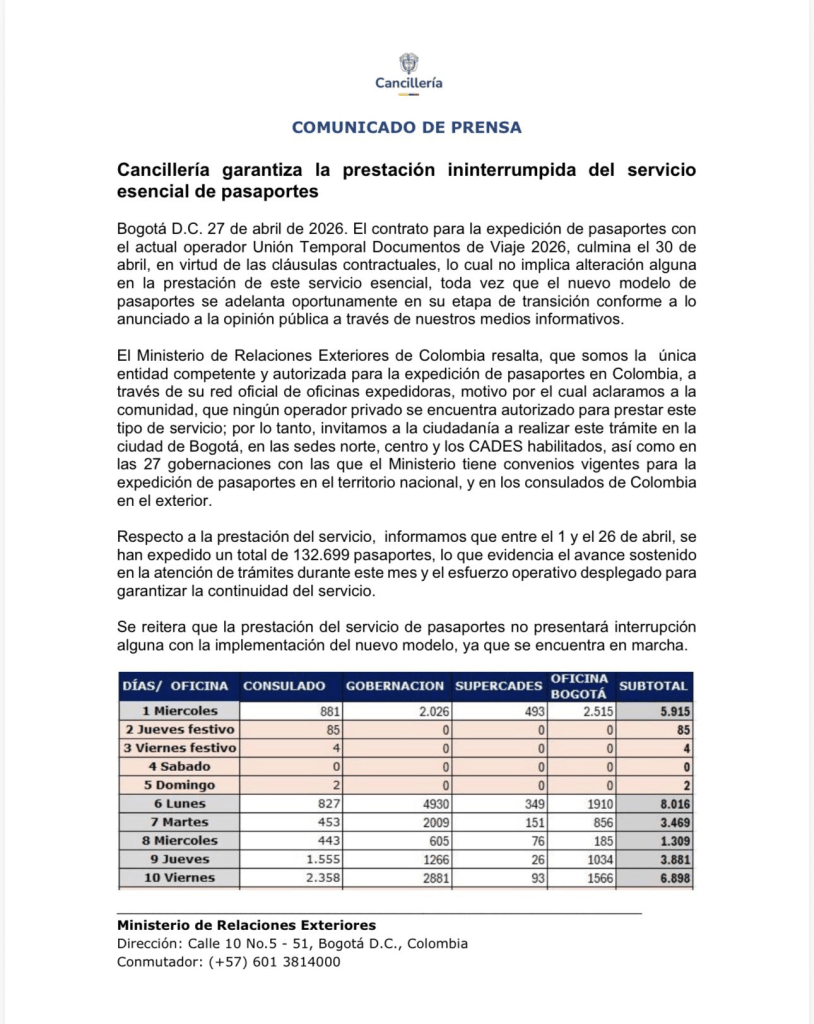 La Cancillería informó que entre el 1 y el 26 de abril se expidieron 132.699 pasaportes en Colombia, en medio de un periodo de transición operativa del sistema de documentos de viaje y de la inminente finalización del contrato con el actual operador.